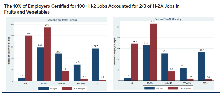 Size structure is easier to measure for the H-2A program because employers specify how many H-2A workers they want. Employer applications do not record the number of US workers who are employed alongside H-2A workers, but most FLCs with H-2A workers have workforces that are almost exclusively H-2A workers.