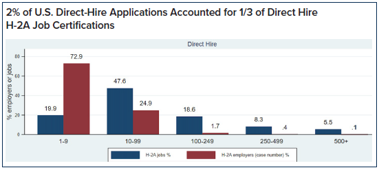 This means that about 100 US employers account for 40 percent of all H-2A jobs, and 600 employers account for 70 percent. DOL analysts spend most of their time processing applications from the 7,500 employers who are certified for less than 10 workers and collectively account for less than 10 percent of total H-2A certifications.